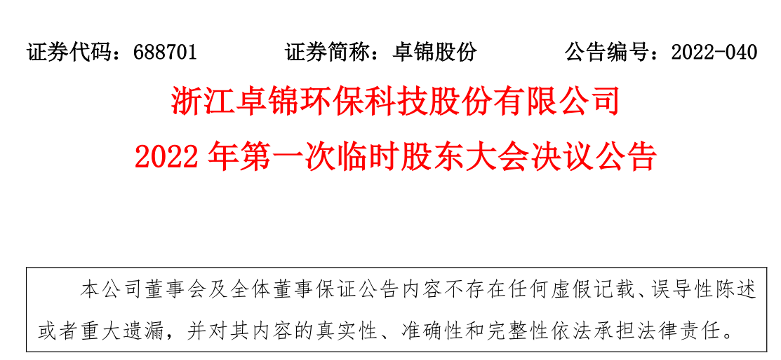 卓錦股份 2022年第一次臨時(shí)股東大會(huì)決議公告