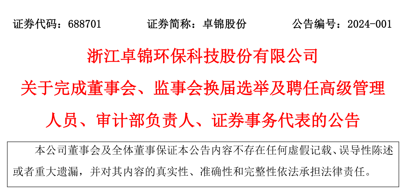 浙江卓錦環保科技股份有限公司關于完成董事會、監事會換屆選舉及聘任高級管理人員、審計部負責人、證券事務代表的公告