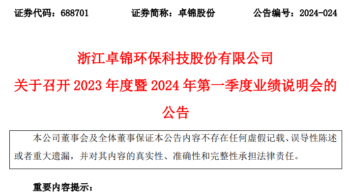 關于召開 2023 年度暨 2024 年第一季度業績說明會的公告
