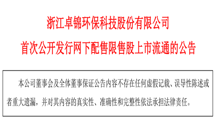 附件:浙江卓錦環(huán)保科技股份有限公司首次公開發(fā)行網(wǎng)下配售限售股上市流通公告